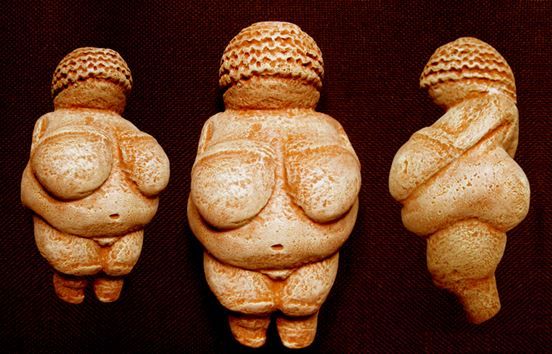 - A estatueta Vênus de Willendorf é um exemplo perfeito. Encontrada na Áustria em 1.908 em um sítio arqueológico do período Paleolítico (Idade da Pedra Lascada). Seus registros apontam que foi esculpida cerca de 22.000 ou 24.000 anos em calcário oolítico (material que não existe na região), apresentando a tonalidade ocre vermelho (colorida artificialmente). Sua forma é explicitamente representada na idealização da figura feminina.